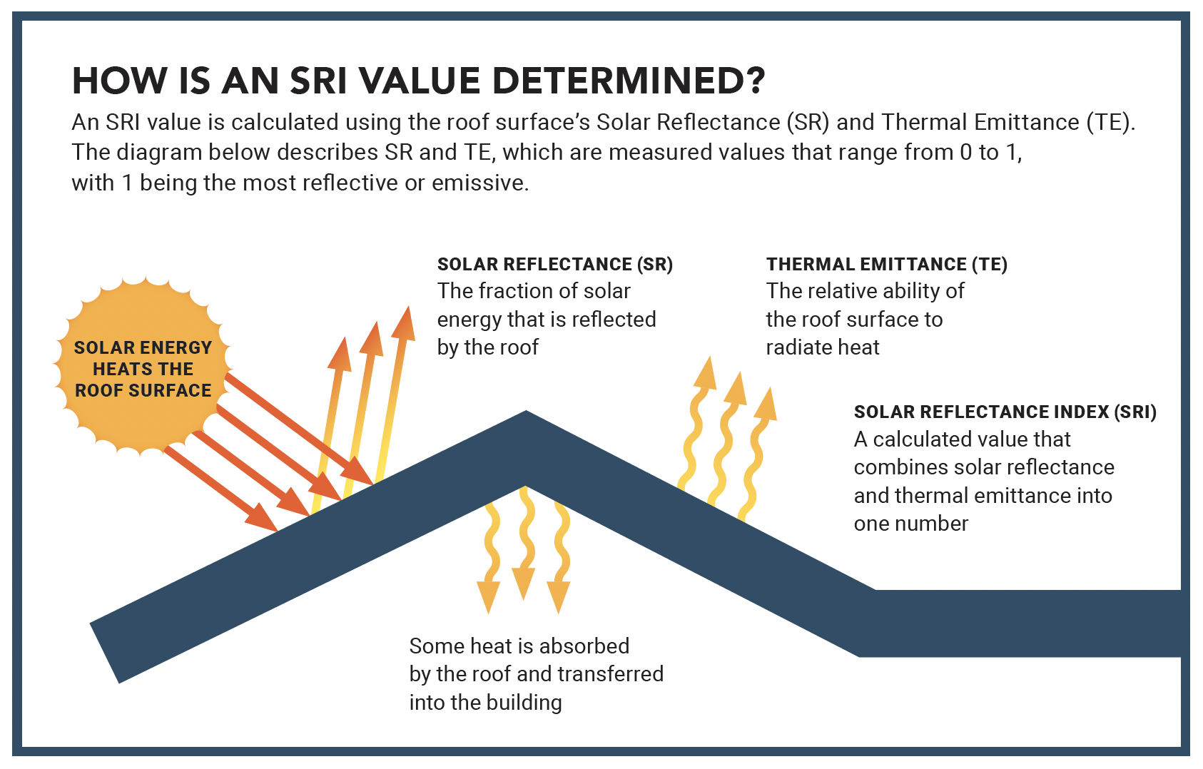 Light-colored roofs (white): SRI ~70-90 → reflect 60-90% of solar radiation